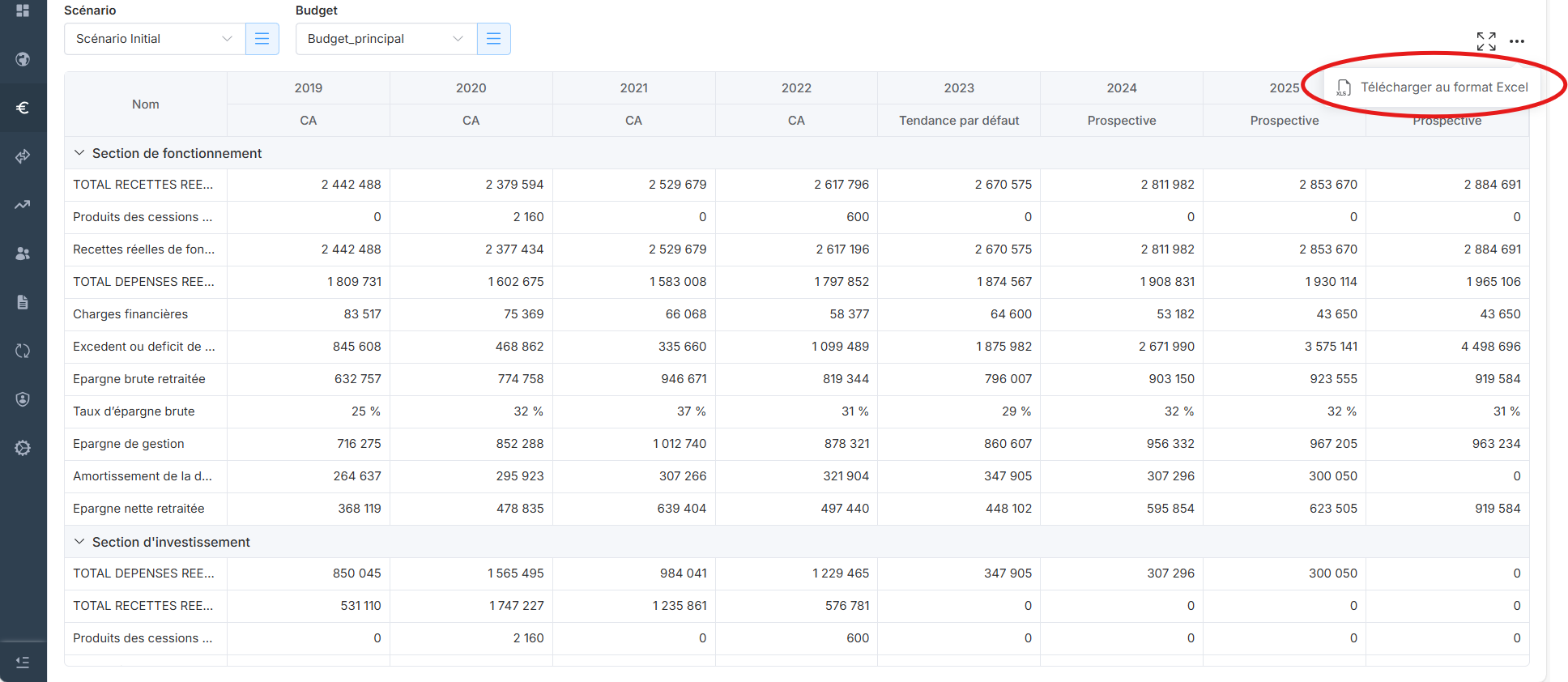 Pour cela, accédez à l'onglet "Vue d’ensemble" du module "Prospective". Sélectionnez le scénario et le budget. Puis cliquez sur l’icône "Télécharger au format Excel" située en haut à droite du tableau. Le fichier .xlsx sera généré automatiquement avec les données affichées à l’écran.