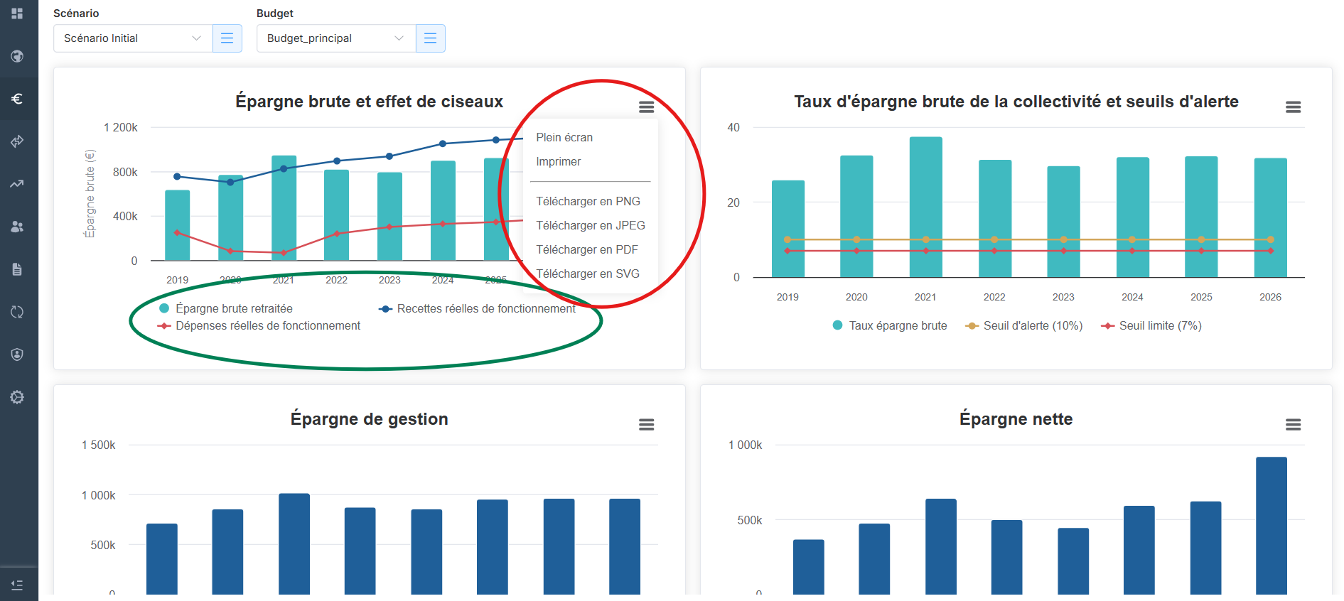 Pour exporter les graphiques il vous suffit de cliquer en haut à droite du graphique et de choisir le format que vous souhaitez pour votre export comme ci-dessous (cercle rouge).