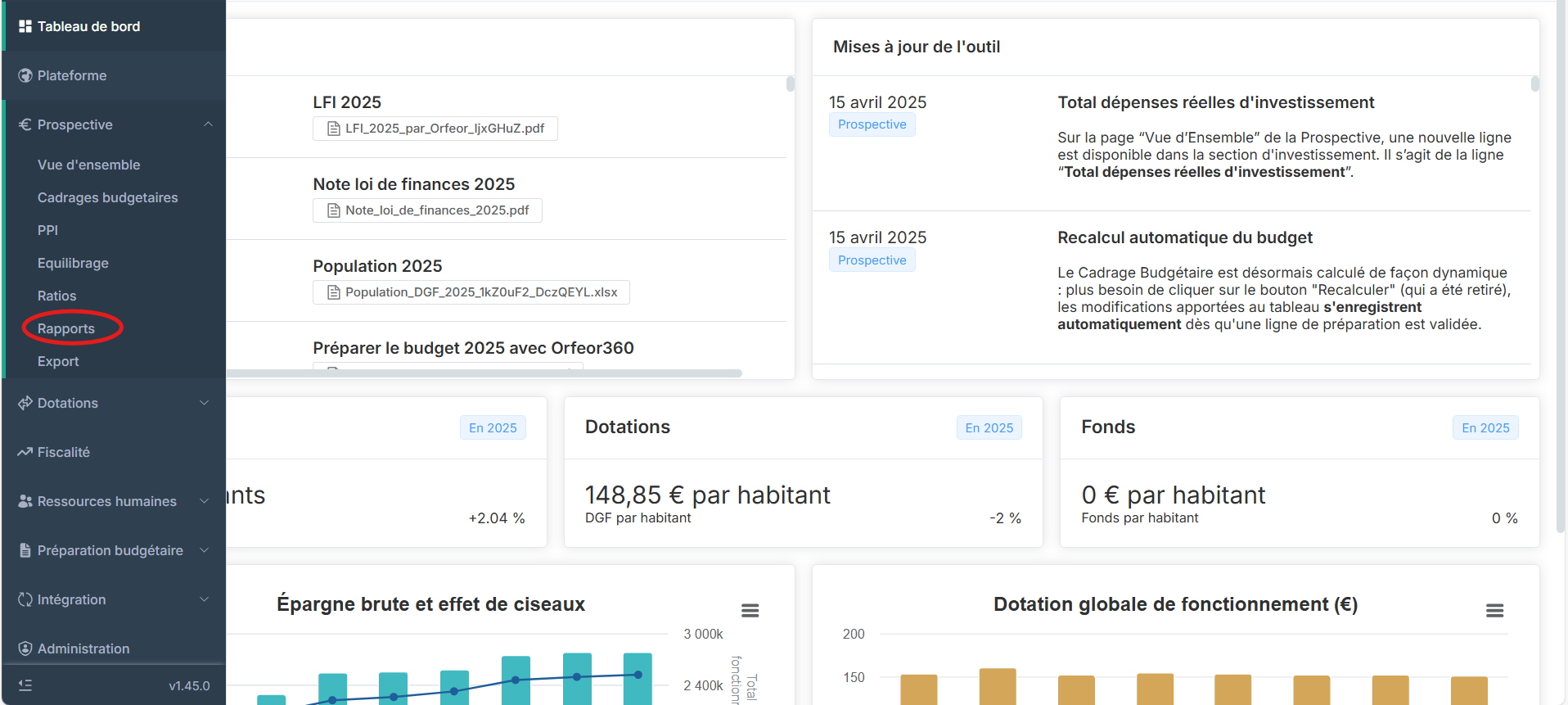 Vous avez la possibilité d'exporter l'ensemble des rapports au format .doc. Pour ce fait, accéder à l'onglet "Rapports" du module "Prospective". En haut de l’écran, sélectionnez le "Scénario" et le "Budget" souhaités à l’aide des menus déroulants. Vous n'avez plus qu'à cliquer sur le bouton "Télécharger" en haut à droite de l’écran. Cela lancera l’exportation du rapport au format word.