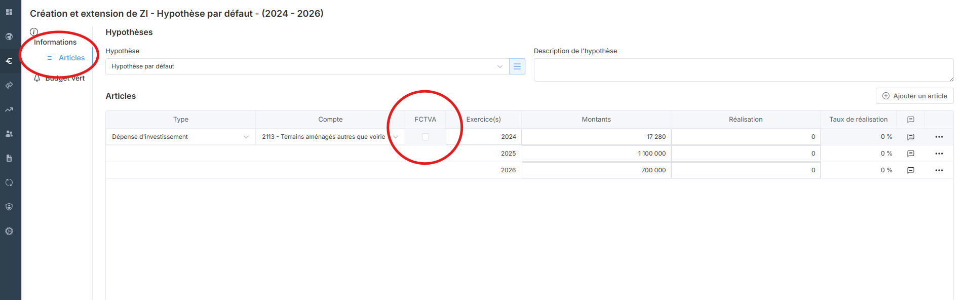 - Enfin, dans l'onglet "Articles", cochez ou non la case FCTVA pour chaque article budgétaire du projet d'investissement. Le FCTVA est alors calculé et enregistré automatiquement pour l'année de perception que vous avez choisie.