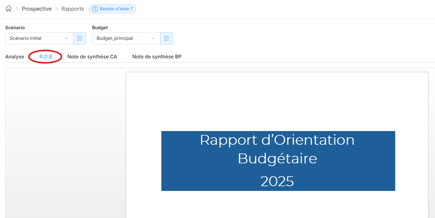 Une fois votre scénario de prospective réalisé dans le module, vous avez la possibilité de générer automatiquement un rapport d'orientation budgétaire (R.O.B) construit à partir des données du scénario initial ou d'un scénario que vous avez élaboré.