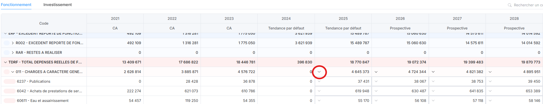 Dans le cadrage budgétaire, vous pouvez définir pour chaque chapitre une tendance d'évolution des montants partant du dernier compte administratif et se reportant sur les années de prospective.